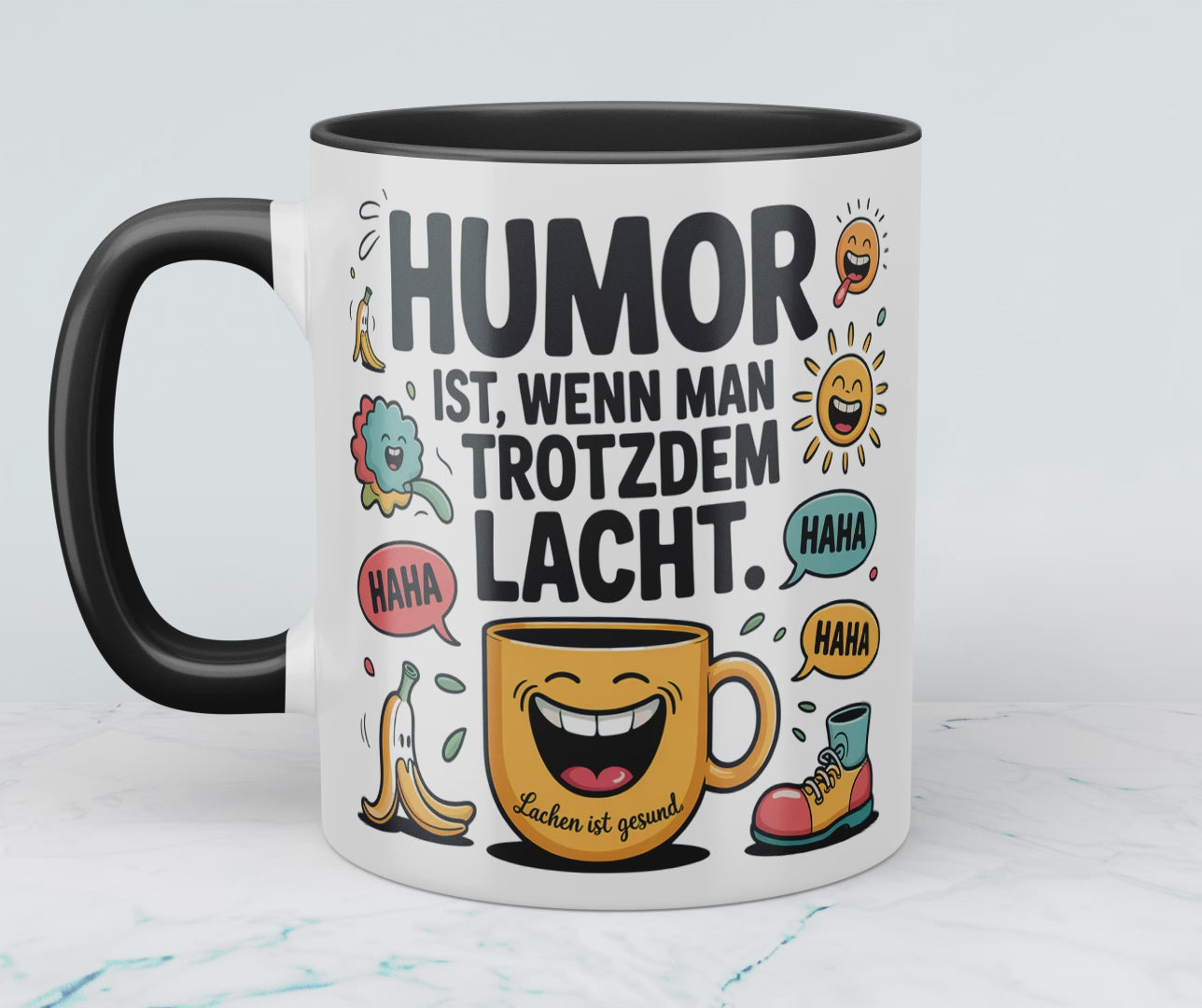 Mit dieser humorvollen Kaffeetasse startest du garantiert mit einem Lächeln in den Tag! Der Spruch „Humor ist, wenn man trotzdem lacht“ bringt gute Laune an jeden Schreibtisch – ob im Büro oder im Homeoffice.