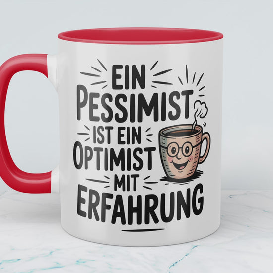Humorvolle Tasse: “Ein Pessimist ist ein Optimist mit Erfahrung” – Witziges Geschenk für Büro-Kollegen