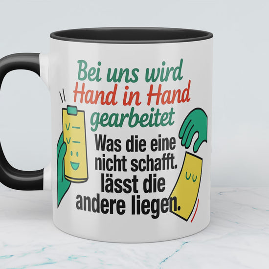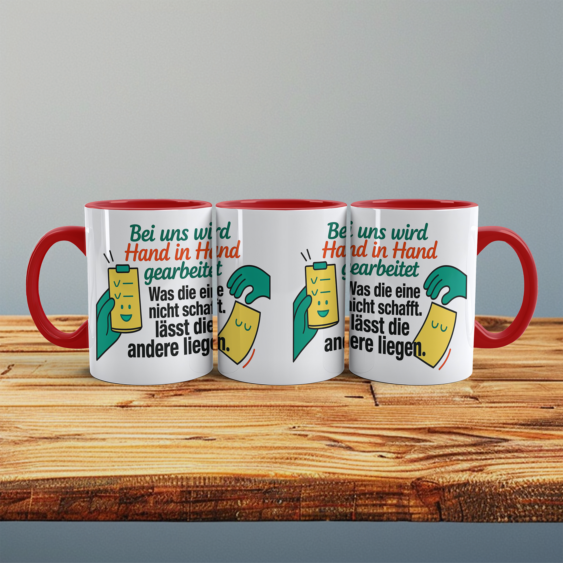 Feiere den Teamgeist mit unserer inspirierenden Kaffeetasse „Bei uns wird Hand in Hand gearbeitet, was die eine nicht schafft, lässt die andere liegen.“ Diese Tasse ist perfekt für alle, die Wert auf Zusammenarbeit und Zusammenhalt im Büro legen.