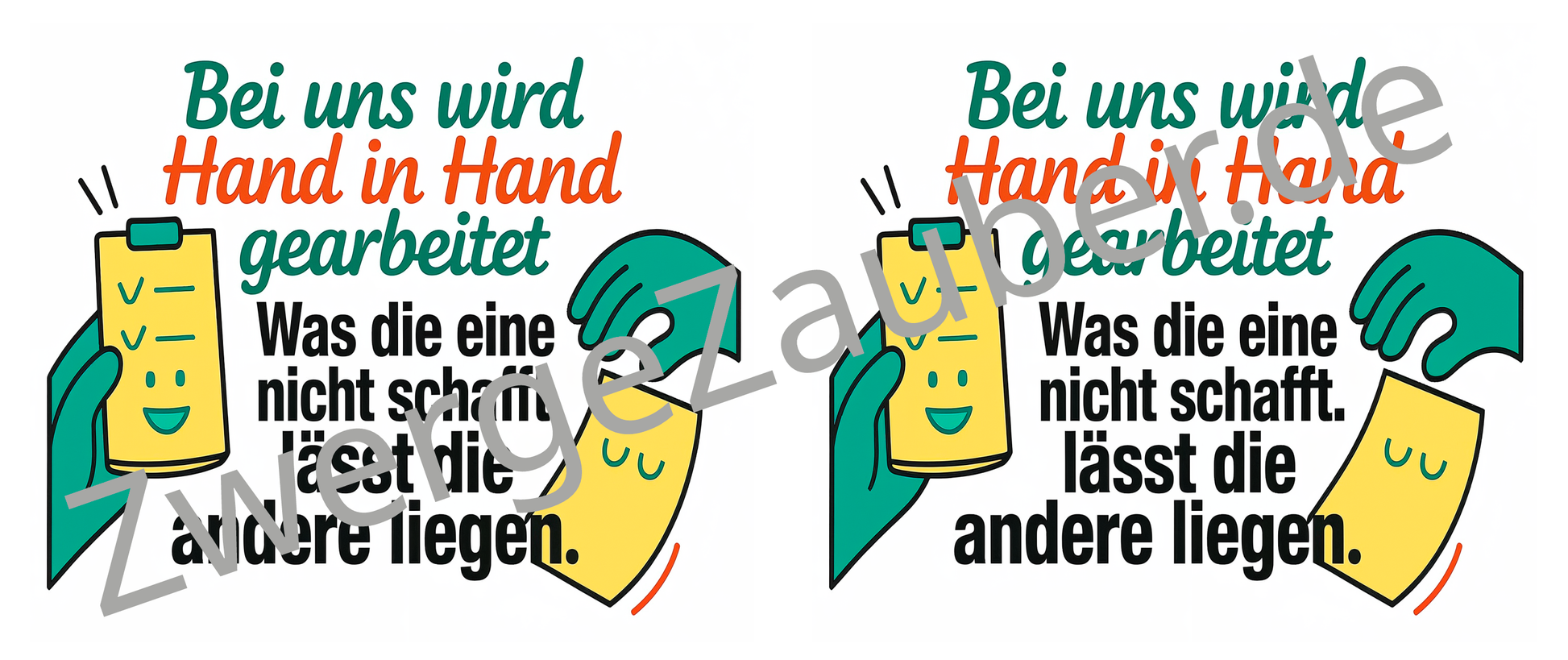 Mit ihrem humorvollen und motivierenden Spruch bringt sie nicht nur ein Lächeln in den Arbeitsalltag, sondern erinnert auch daran, dass Teamarbeit der Schlüssel zum Erfolg ist.