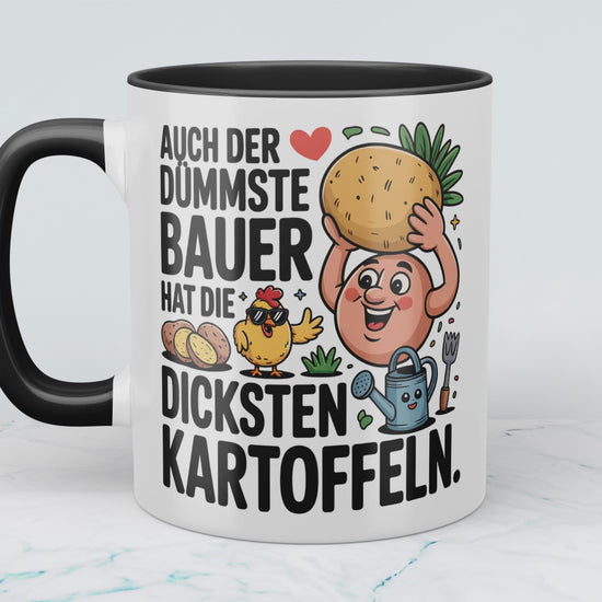 Witzige Bürotasse für Kollegen mit Spruch: "Auch der dümmste Bauer hat die dicksten Kartoffeln"