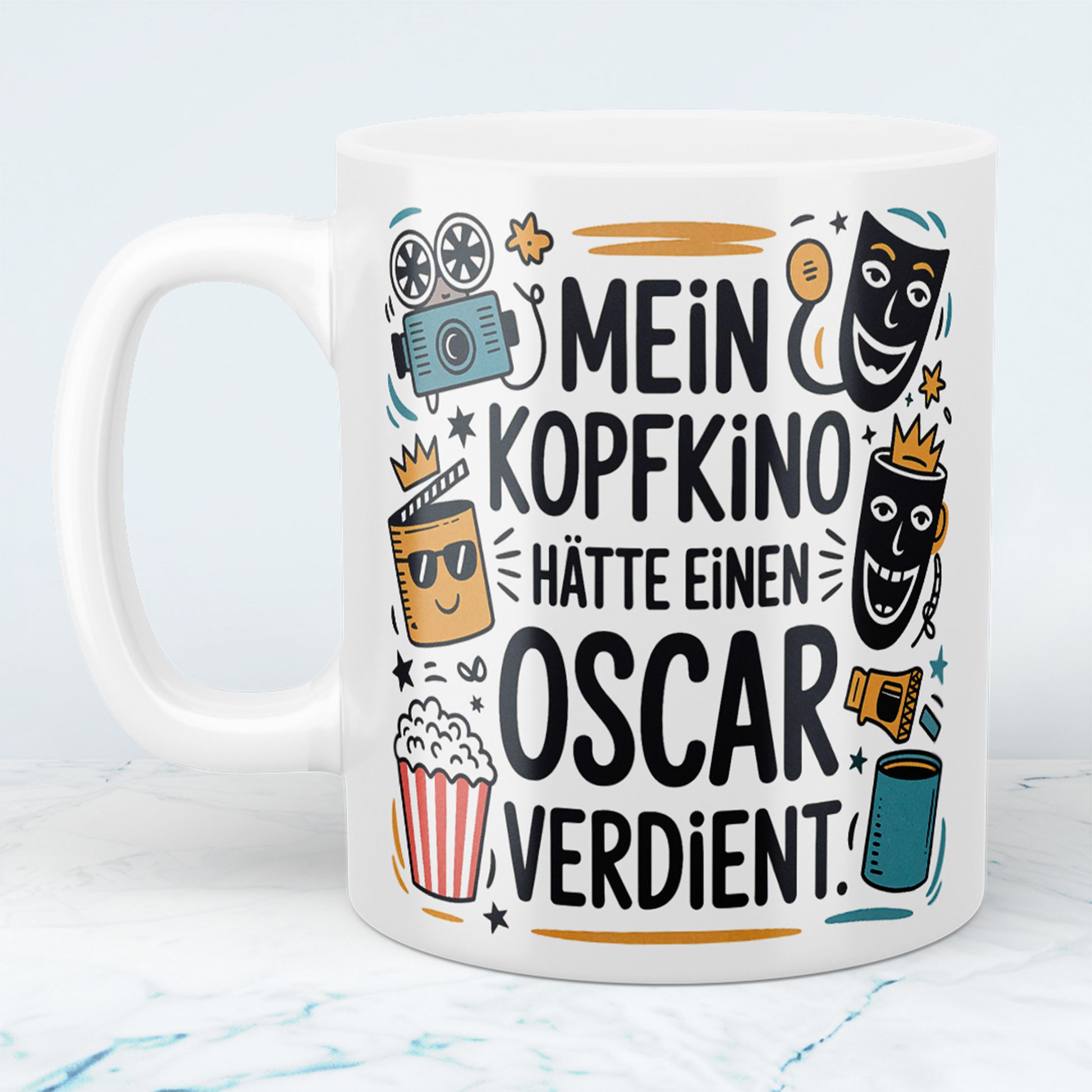 Diese witzige Kaffeetasse fürs Büro ist das ideale Geschenk für Kollegen, Freunde oder Familie, die Humor lieben! Mit dem Spruch „Mein Kopfkino hätte einen Oscar verdient“ sorgt sie garantiert für Lacher und gute Stimmung am Arbeitsplatz oder zu Hause.