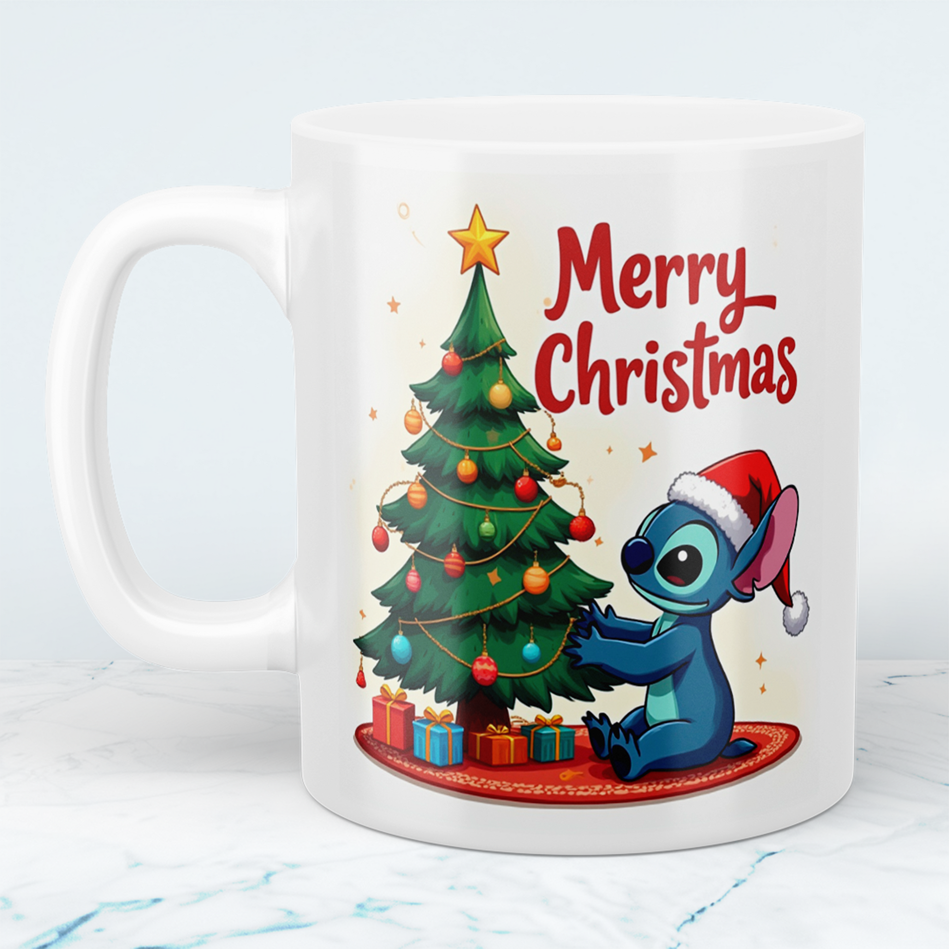 Feiern Sie die festliche Jahreszeit mit unserer lustigen bedruckten Weihnachts-Tasse, die Stitch vor einem prachtvollen Weihnachtsbaum zeigt! Diese Tasse ist nicht nur ein Charmant-Hingucker, sondern auch ein echter Ausdruck von Freude und Weihnachtsstimmung.