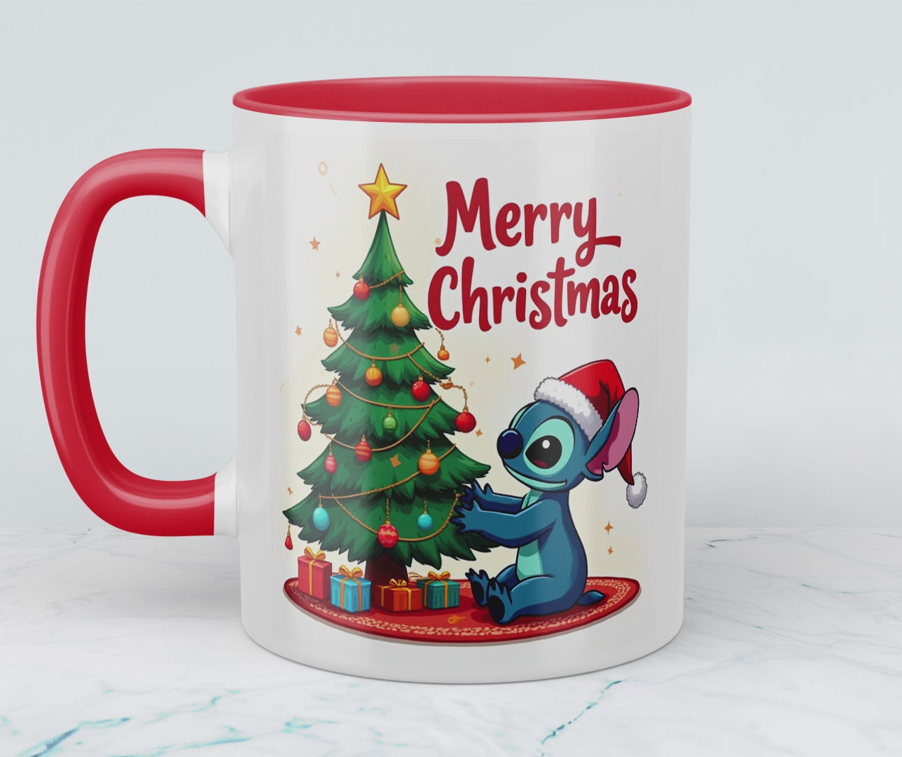 Lustige bedruckte Weihnachts-Tasse mit Stitch vor dem Weihnachtsbaum – Perfektes Geschenk für Weihnachten!