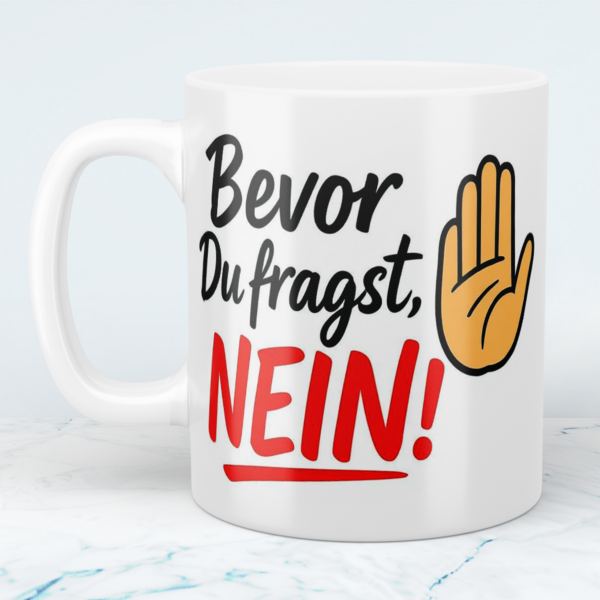 Lustige Bürotasse mit Spruch: "Bevor Du Fragst, NEIN! – Für den perfekten Arbeitsalltag"