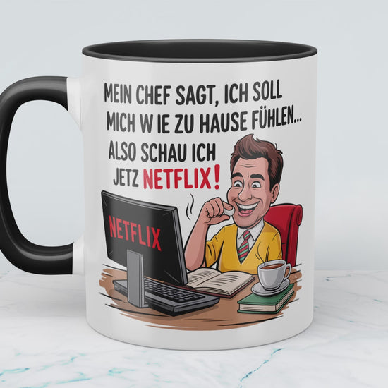 Lustige Bürotasse mit Spruch: Mein Chef sagt, ich soll mich wie zu Hause fühlen – also schau ich jetzt Netflix!