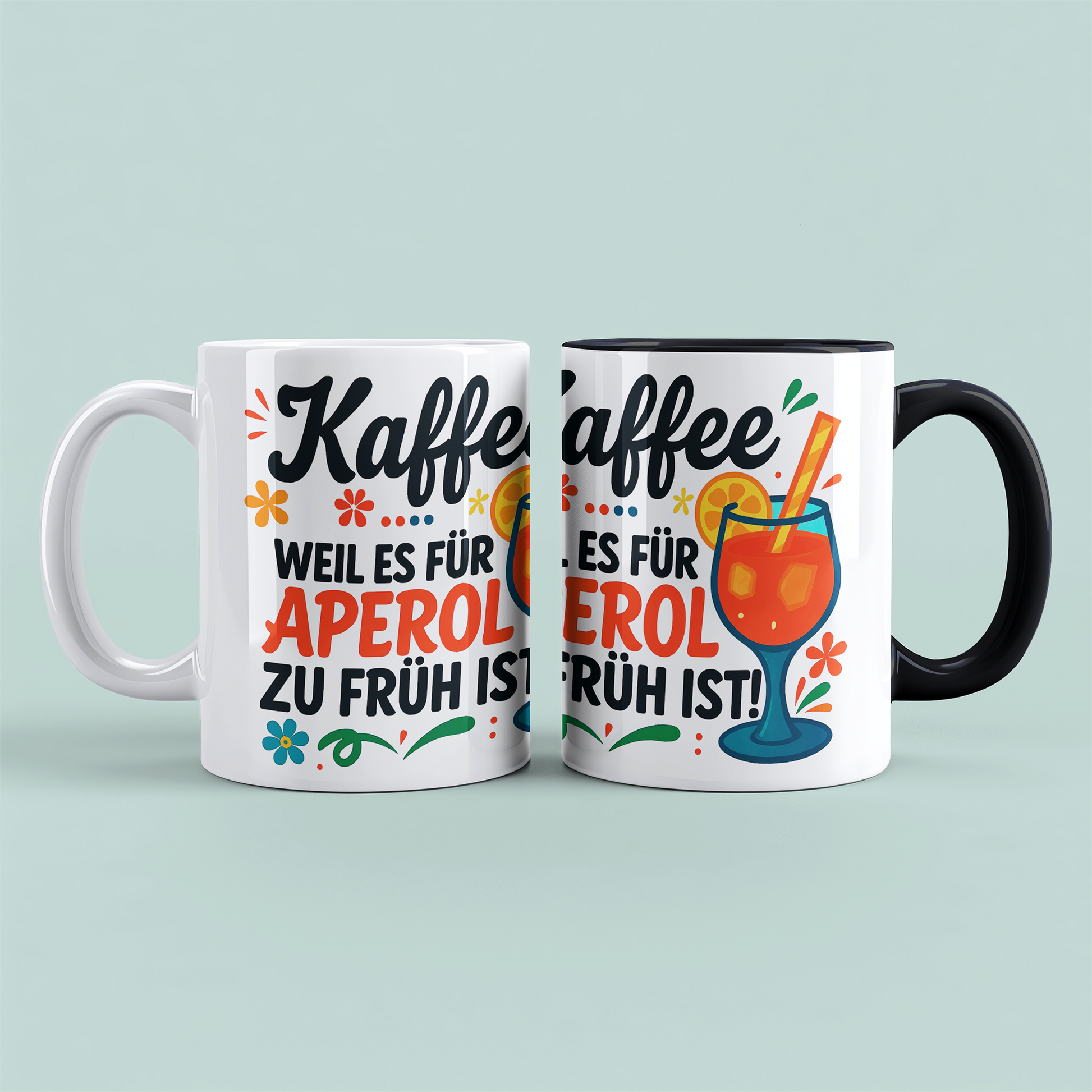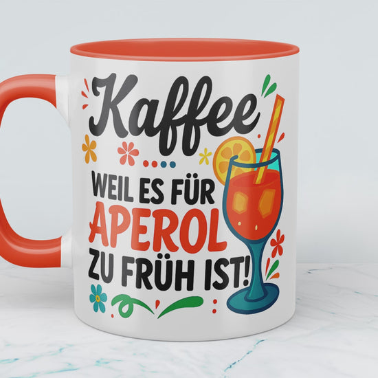 Lustige Kaffeetasse für Kollegen mit Spruch: Kaffee, weil es für APEROL zu früh ist!
